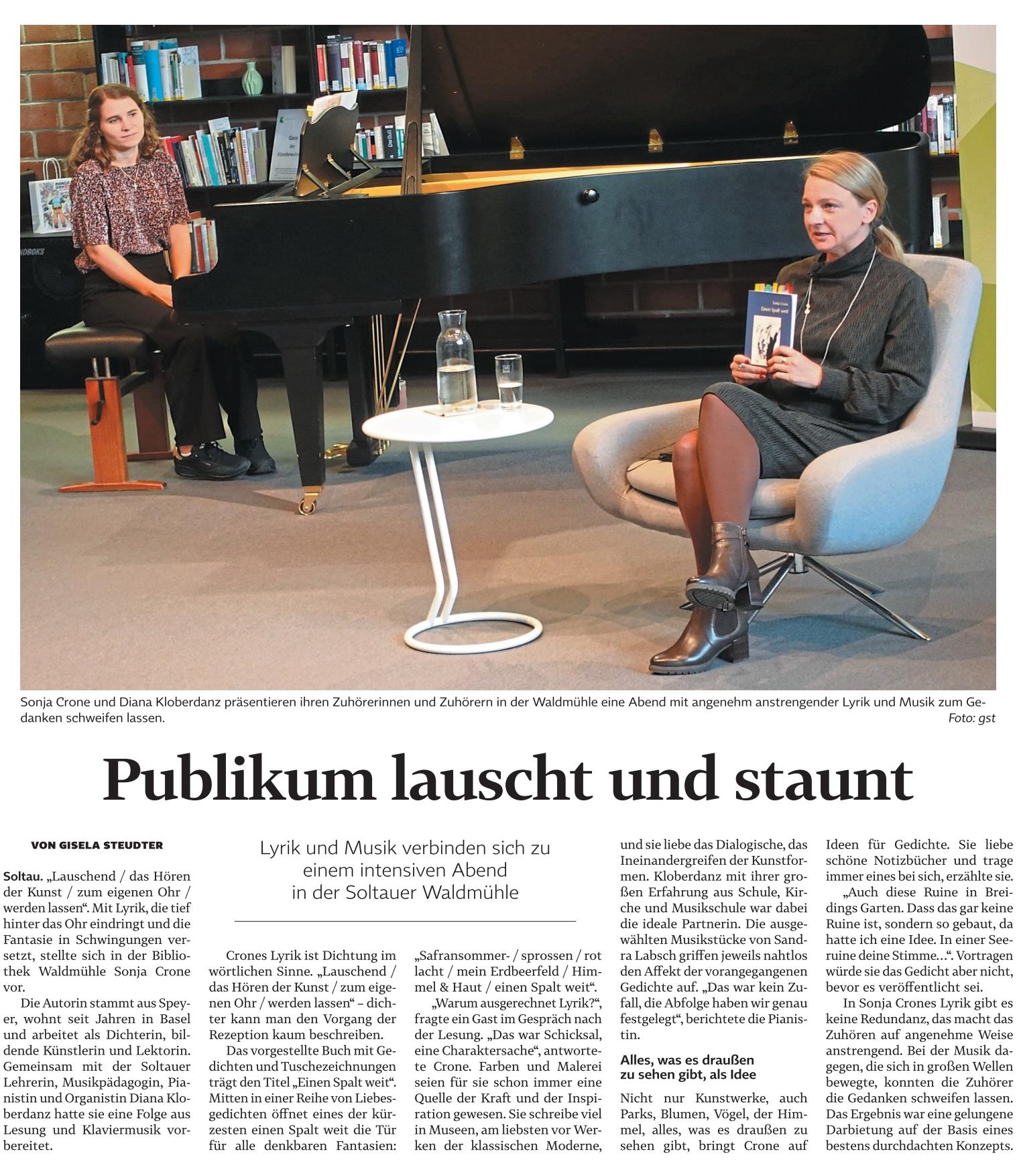 An zehn Veranstaltungstagen stellten 43 Autor*innen aus der Region ihre Werke und ihr Schaffen vor, haben gelesen und performten. Ein bunter Strauss Literatur für alle und ein umfassendes Programm für Kinder, Jugendliche und Schulen haben der Verein LEIMENTALE in Zusammenarbeit mit dem Autor*innen-Netzwerk «lokal lesen» zusammengestellt. Die Lyrikerin Sonja Crone lass am 08.05. mit Denise Buser und Julia Rüegger, die musikalisch begleitet wurde von Tobias Pfister.